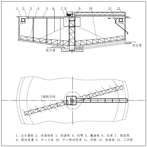 該設備采用中心傳動、垂架式,汙水從進水管流入導流筒擴散後,均勻的向周邊呈輻射狀流出,呈懸浮狀的汙泥經沉澱後沉積於池底,驅動裝置帶動中心豎架旋轉,並帶動刮臂及刮泥板轉動,將汙泥從池周刮向中心集泥槽後,靠池內靜水壓由排泥管排出池外。水麵的浮渣通過撇渣裝置撇向池邊,再由刮渣耙刮進排渣鬥內排出池外。而上清液則通過出水堰板溢入出水槽內排出。